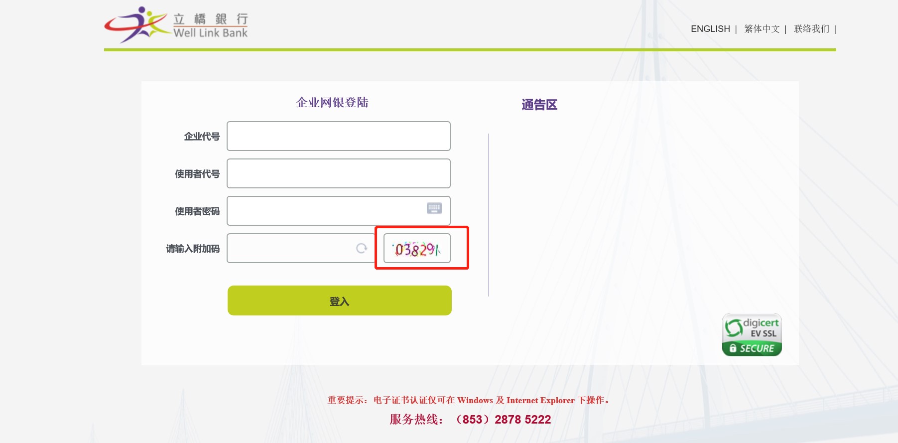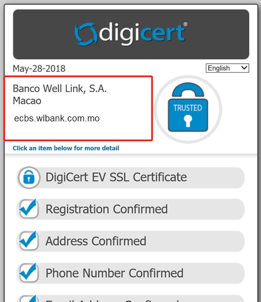 - 本行的认证由digicert颁发予 "ecbs. wlbank.com.mo, Banco Well Link, S.A. Macao"。