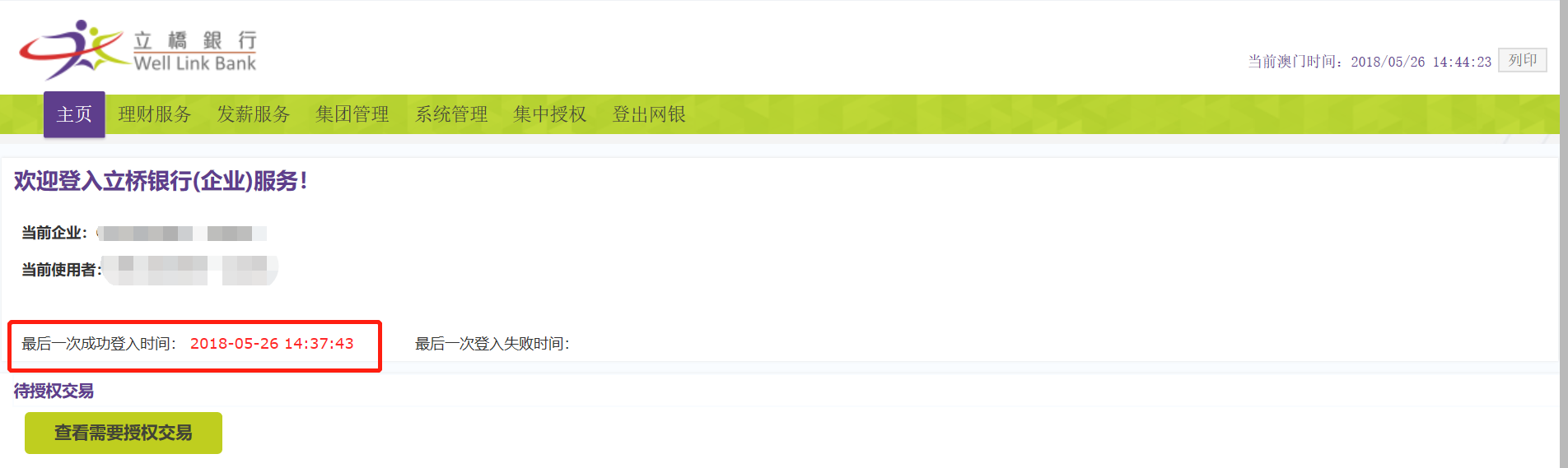- 当使用者每次成功登入网上银行进入主页版面时,会显示使用者上次成功登入以及上次登入失败的时间。如使用者发现上次登入时间有异,请即时更改个人密码,并即与本行联络。