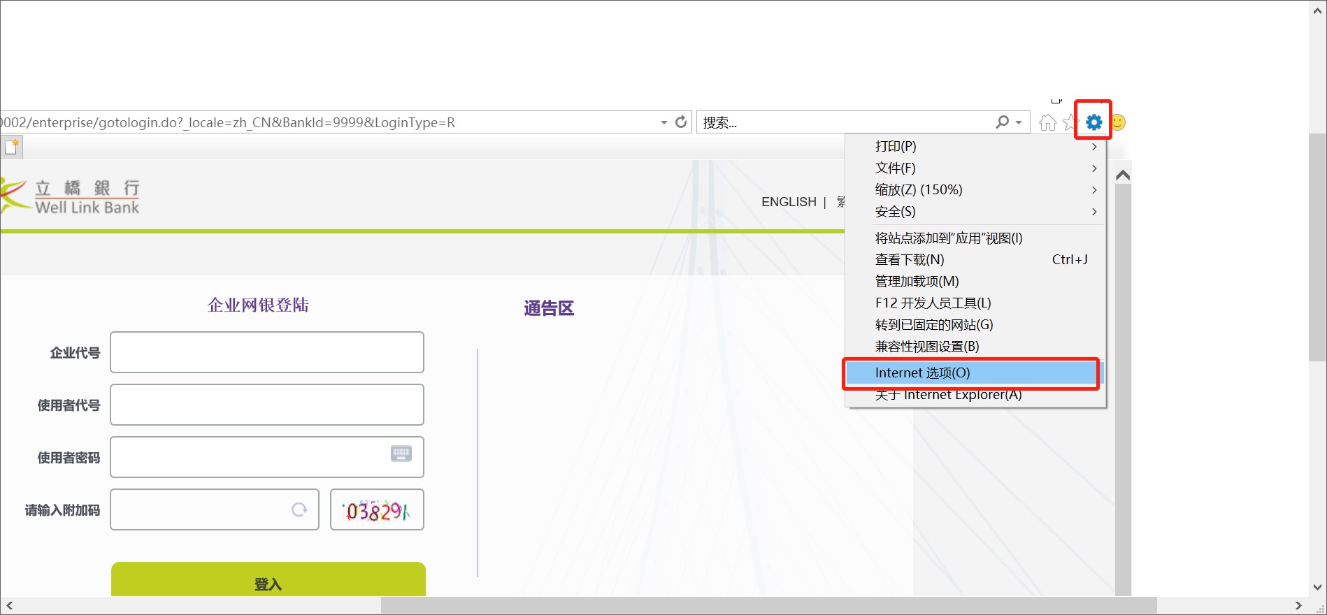 步骤1:点击IE浏览器右侧“ ”图标→【Internet选项】