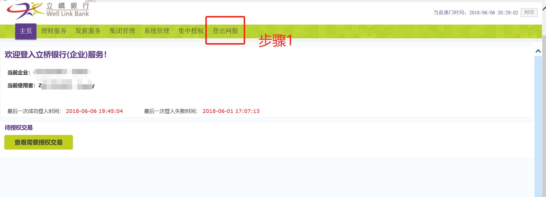 步骤1:点击「登出网银」;
