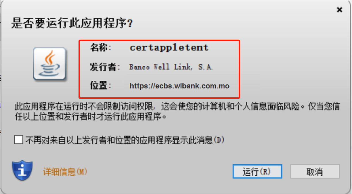 - 使用者使用「电子证书」作为认证工具登入「企业网银 」或进行网上交易时,系统会在使用者的电脑执行特定的 Java applet 程式软件。当未设置信任证书或每次更新Java配置后,浏览器为保障网上安全可能会有以下视窗显示有关程式签署证书及验证资料,以助使用者分辨程式真伪。